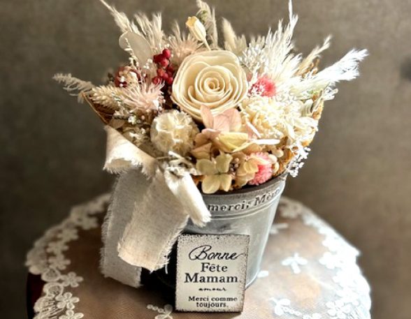 やさしい色合いのブリザーブドフラワーやドライフラワーをふんわり詰め込んだインテリアににもなじむブリキポットのアレンジメント。手づくりの贈り物で、「ありがとう」の気持ちを届けてみませんか。不定期でWS開催中です。